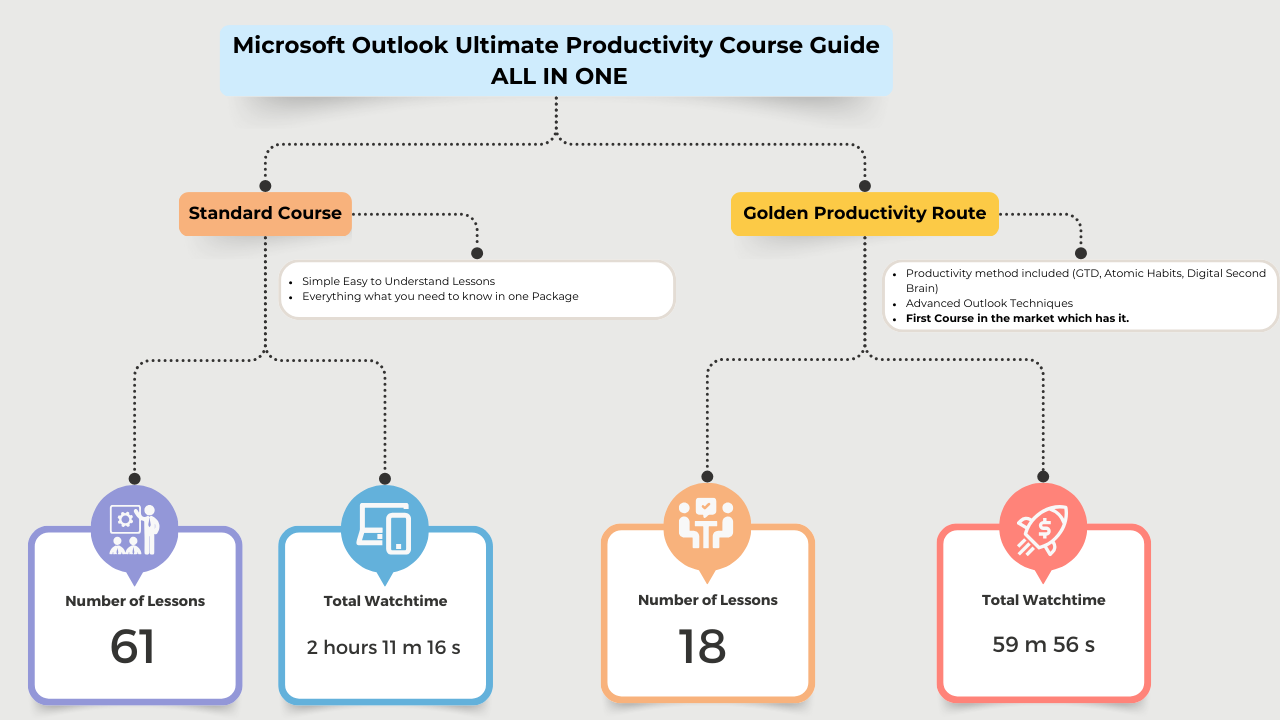 This is the only course outhere which will take you through in less than 1 hour. After that you will be able to implement all the productivity methods I am teaching you into your worklife. If you will want to know about outlook than you can watch the rest of the lessons. Check the Roadmap below: